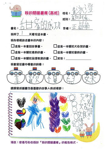 此外,感謝家長積極參與閱讀計劃,並用心地設計別具一格的《我的閱讀書庫-閱讀報告》,為孩子建立愛書人的好榜樣。