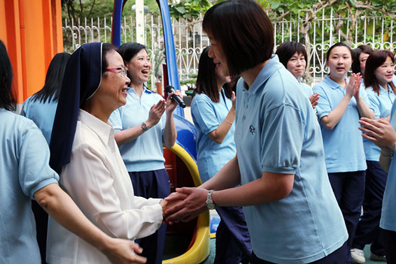 2015年3月19日是甘修女的瞻禮日,我們一眾師生及職員排列成十字架,一起為甘修女慶祝,藉著歌詠及獻花感謝甘修女一年來的帶領及照顧,並祝福她身體健康,主寵滿溢,天充滿喜樂及平安!看!甘修女笑得多麼的燦爛!