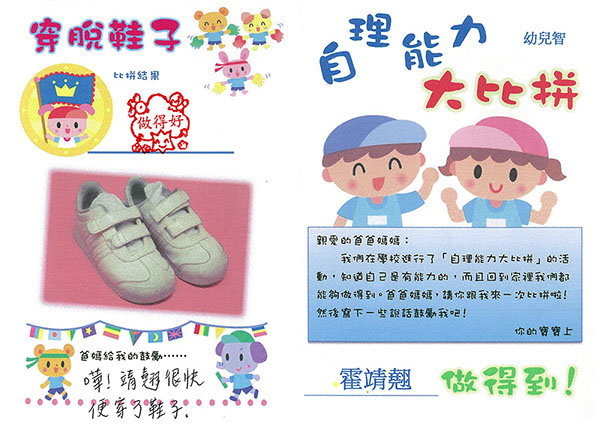 配合教學主題「小猴子長大了」,幼兒班於2014年11月25日進行了「自理能力大比拼」活動。活動透過比拼形式,加強幼兒的自理能力,激勵他們自行穿脫鞋子及外套,並自行收拾茶點物品。比拼過程中,幼兒更學習給予同伴鼓勵,互相打氣,從而加深大家的友誼。