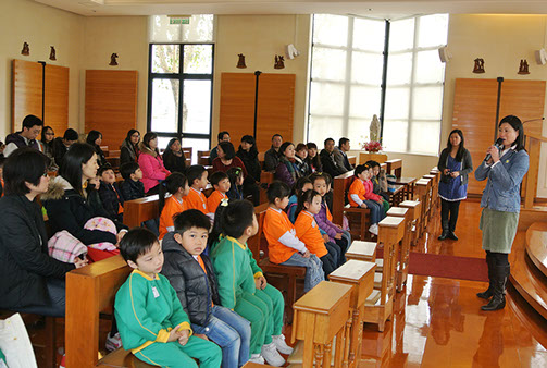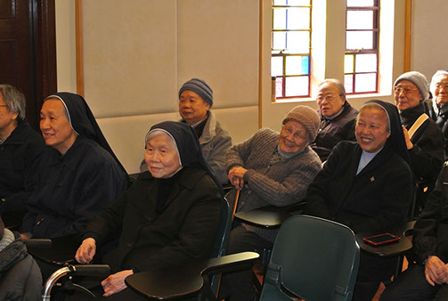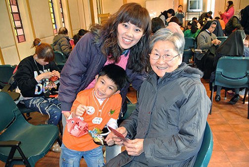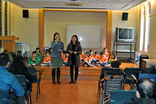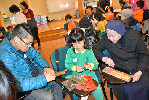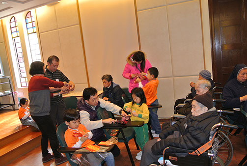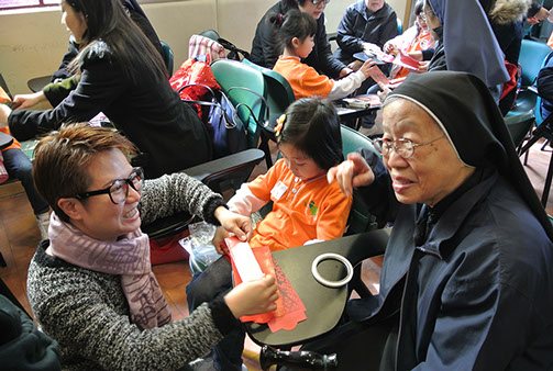 2015年2月7日(六),家教會與本園基督小幼苗合辦「家校同心表關懷~親子探訪寶血會長者修女」的活動。我們上午10時到達粉嶺寶血會。由司儀彭麗儀老師及家教會主席林玉娟女士引領小朋友頌唱: 「基督小幼苗隊歌及 耶穌喜愛小孩像愛我」來感謝天主。熱身表演後,為了表示敬愛長者修女,小朋友唱「敲咚咚」並隨著音樂替公公婆婆們搥骨,場面十分溫馨。葉主任也帶動全場齊做「十巧操」。新年將至,我們與長者修女一起製作一條金魚作賀年吊飾,你看! 大家很投入地工作。最後家長和孩子們齊到教堂做祈禱,感謝天主賜與長者修女和我們的「愛」。